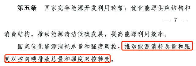 第五條:國家完善能源開發(fā)利用政策,優(yōu)化能源供應(yīng)結(jié)構(gòu)和消費結(jié)構(gòu),推動能源清潔低碳發(fā)展,提高能源利用效率。國家優(yōu)化能源消耗總量和強度調(diào)控,推動能源消耗總量和強度雙控向碳排放總量和強度雙控轉(zhuǎn)變。