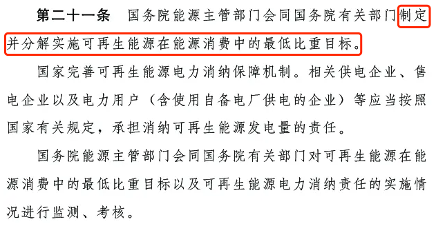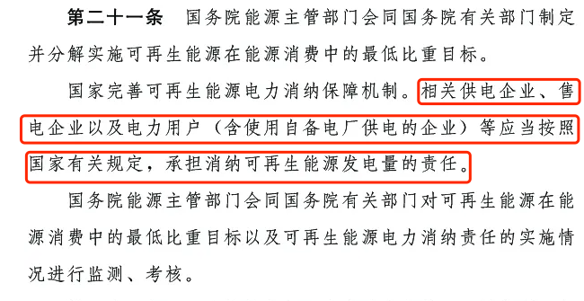 第二十一條:國家完善可再生能源電力消納保障機制。相關(guān)供電企業(yè)、售電企業(yè)以及電力用戶 (含使用自備電廠供電的企業(yè))等應(yīng)當按照國家有關(guān)規(guī)定,承擔消納可再生能源發(fā)電量的責任。國務(wù)院能源主管部門會同國務(wù)院有關(guān)部門對可再生能源在能源消費中的最低比重目標以及可再生能源電力消納責任的實施情況進行監(jiān)測、考核。