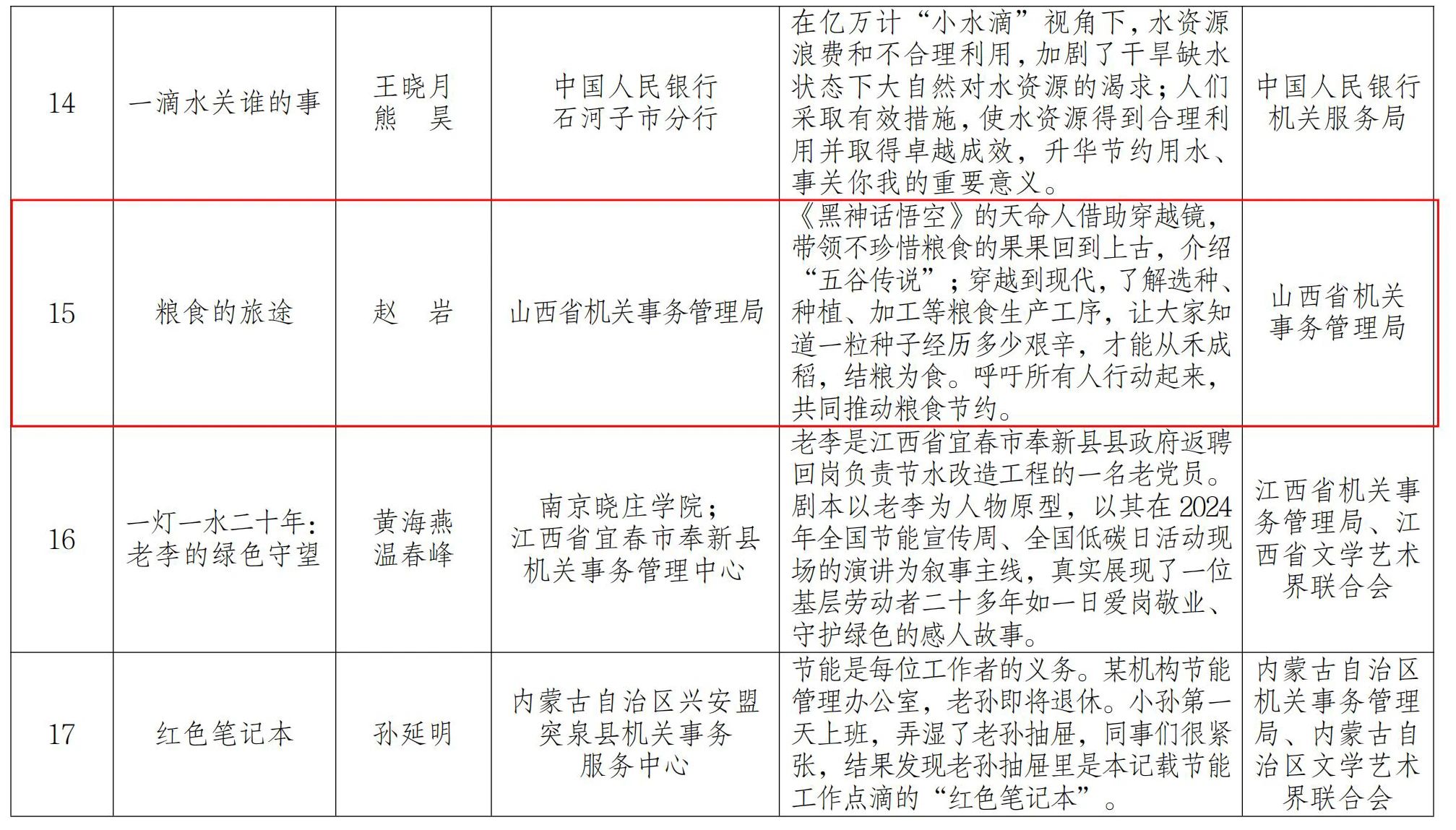 近日,國管局辦公室、中國文聯(lián)辦公室組織的2024年公共機(jī)構(gòu)節(jié)能主題優(yōu)秀劇本和故事征集活動結(jié)果揭曉,山西省機(jī)關(guān)事務(wù)管理局選送的劇本《糧食的旅途》入圍優(yōu)秀劇本獎(jiǎng)項(xiàng)。